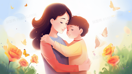 鲜花包围的母亲拥抱孩子温馨母亲节插画