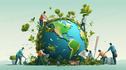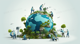 3D立体模型地球上正在建设绿色生态环境的人们插画