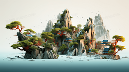 > 3D立体险峻高山上长满树木建筑风景插画