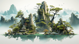 中国风山水树木建筑风景古典国画插画