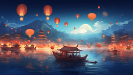 > 中国风江南水乡中元节灯火通明建筑风景插画