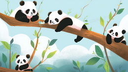 > 卡通一群可爱的熊猫趴在树上玩耍