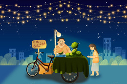 夏日夜晚大叔摆摊卖西瓜手绘插画