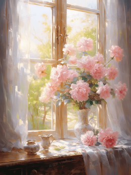 蓝色系窗边花瓶花朵花卉油画静物插画