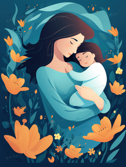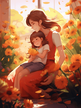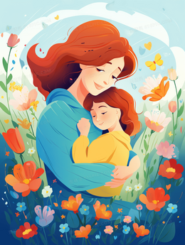 鲜花包围的母亲拥抱孩子温馨母亲节插画