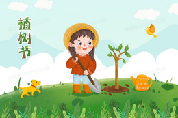 植树节小女孩在户外植树手绘插画