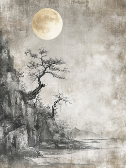 做旧中国风明月山水风景插画