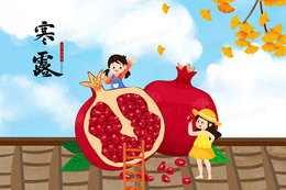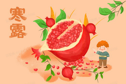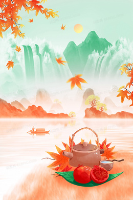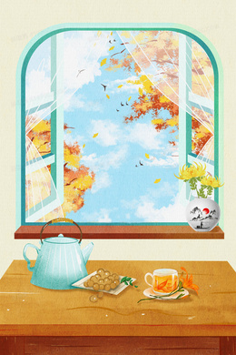 手绘寒露秋天窗边赏落叶喝菊花茶养生插画