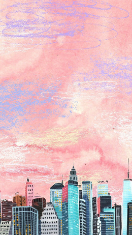 插画城市建筑背景粉笔质感粉色背景H5背景
