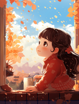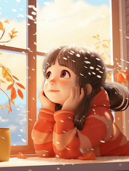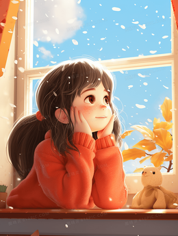 霜降节气阳台上思考的小女孩插画