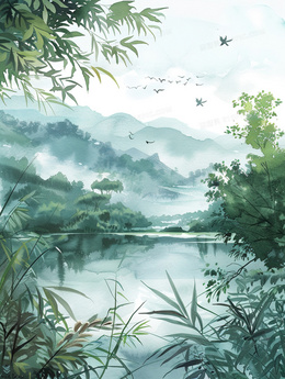> 春天山谷中的湖泊插画