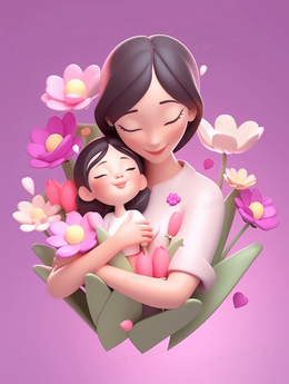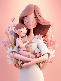 3D卡通风妈妈抱着小女孩鲜花环绕插画