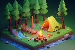 夜晚燃起篝火的小溪边有一个露营帐篷C4D模型