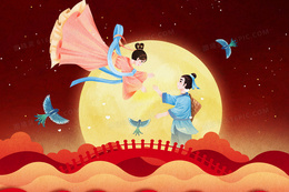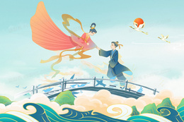 手绘国潮七夕牛郎织女鹊桥相会背景