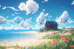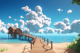 蓝天白云海边度假沙滩水上木屋