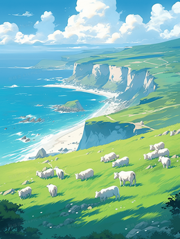 > 蓝天白云岛屿大海山羊唯美风景插画