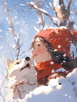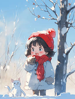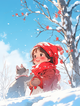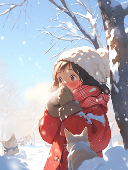 冬日里可爱的小女孩带宠物站在霜冻树下插画