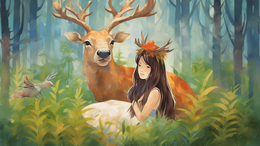 女孩和驯鹿唯美清新麋鹿森林女孩插画
