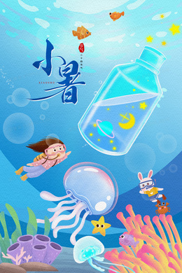 夏日女孩和兔子海底潜水漂流瓶创意治愈插画