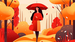 秋天美丽女孩打着伞从树林小路走过