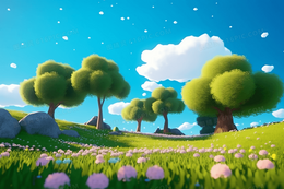 梦幻卡通蓝天白云草坪户外风景