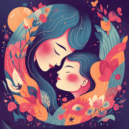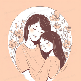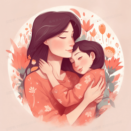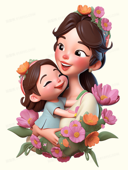 3D卡通风头戴鲜花的女孩趴在妈妈怀里撒娇插画