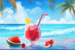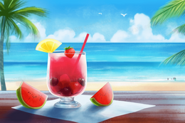 卡通风夏日海边摆着西瓜汁背景图