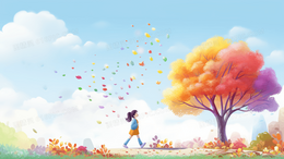 > 秋天金色树林落叶纷飞风景插画