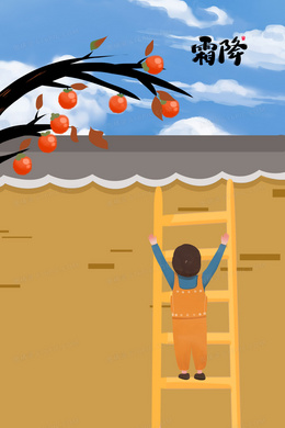 秋天霜降男孩爬梯摘柿子插画