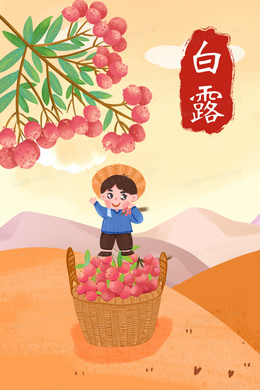 白露节气男孩站在荔枝框上摘荔枝插画
