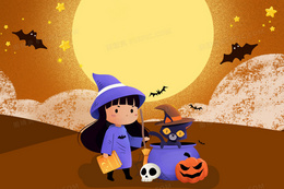 万圣节女巫的南瓜屋卡通节日宣传插画