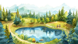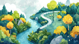 > 春分唯美水彩风森林小河插画