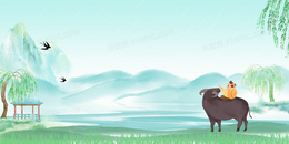 清新中国风水墨山水清明节牧童背景