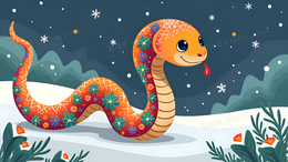 新年喜庆可爱蛇在雪地花卉共舞扁平背景