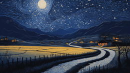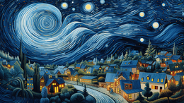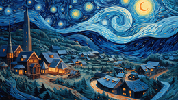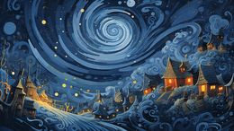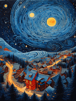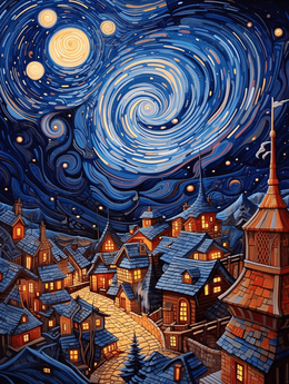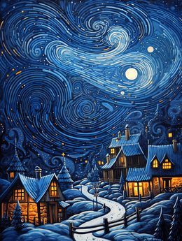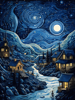 > 蓝色梵高创意星空小镇插画