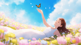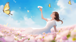唯美少女躺在花丛中触摸蝴蝶创意插画