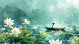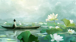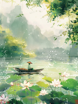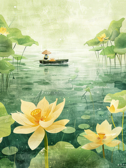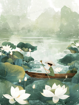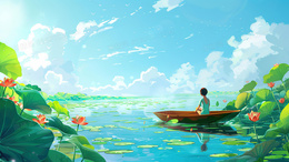 > 蓝天下的荷塘里一个人撑着小舟观光插画