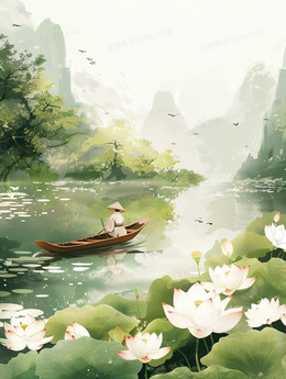 荷花盛开的荷塘里一个人撑着小舟观光插画