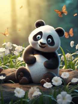 卡通大熊猫在森林与蝴蝶玩耍插画