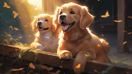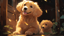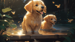 卡通可爱金毛小狗在草地与蝴蝶玩耍插画