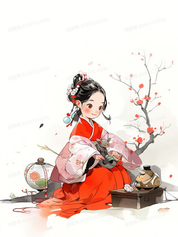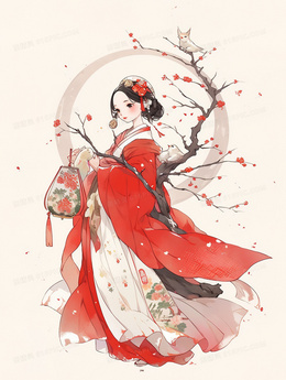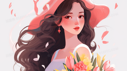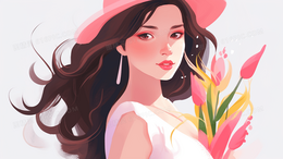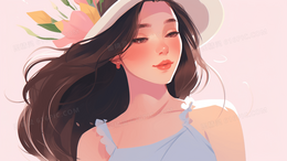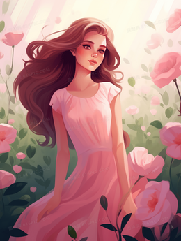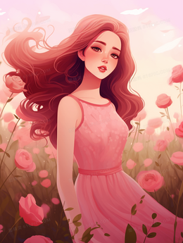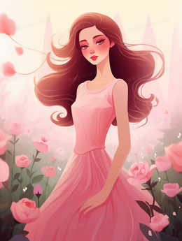 粉色花海中的长发美丽女子插画