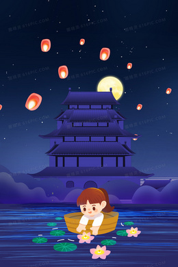 中国风中元节古建筑孔明灯河灯祭祀背景