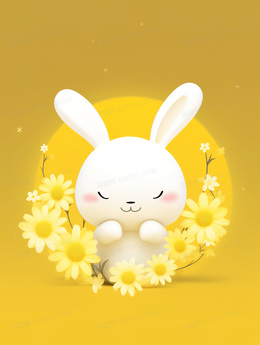 金色小雏菊花丛中的小白兔可爱卡通插画