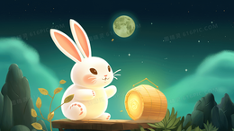 夜晚山林中被灯笼灯火照亮的可爱小白兔插画