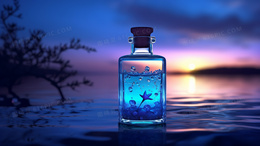 海边沙滩上美丽的漂流瓶晚霞夜景插画