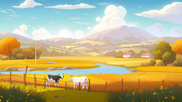 > 金色秋天郊外农庄唯美自然风光创意插画