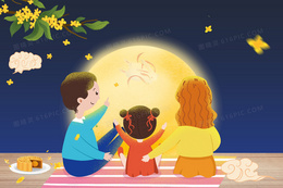 手绘中秋节一家四口一起吃月饼大闸蟹团圆饭治愈系插画