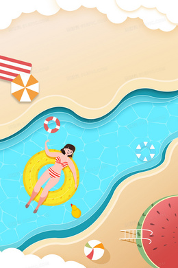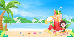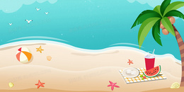 > 夏季清新夏天沙滩椰树冷饮西瓜背景