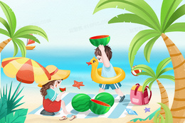 西瓜女孩沙滩椰树二十四节气夏至背景