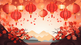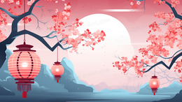> 中国风春节喜庆灯笼花朵树木风景插画